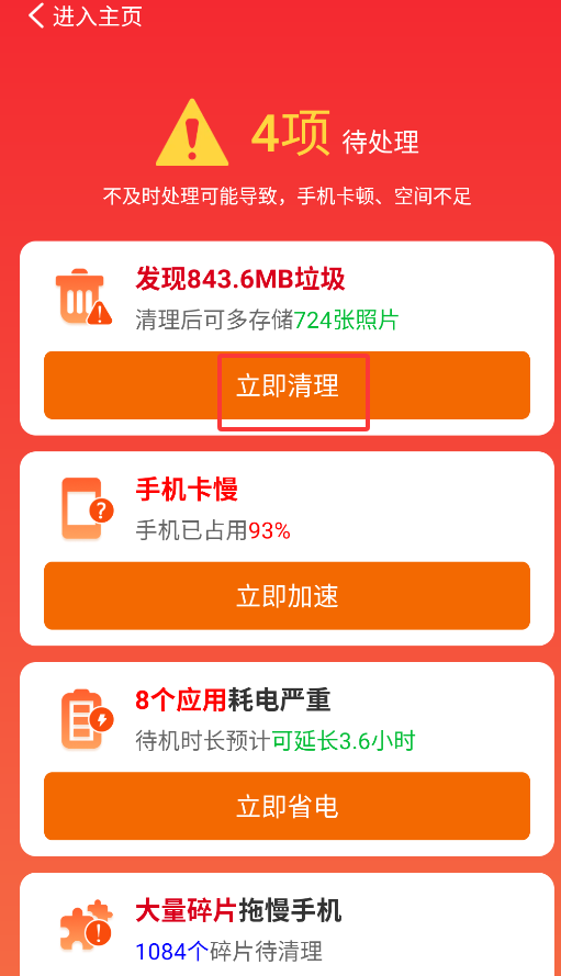 1、启动后,点击首页“一键清理”按钮,自动扫描缓存、残留文件等可清理项。