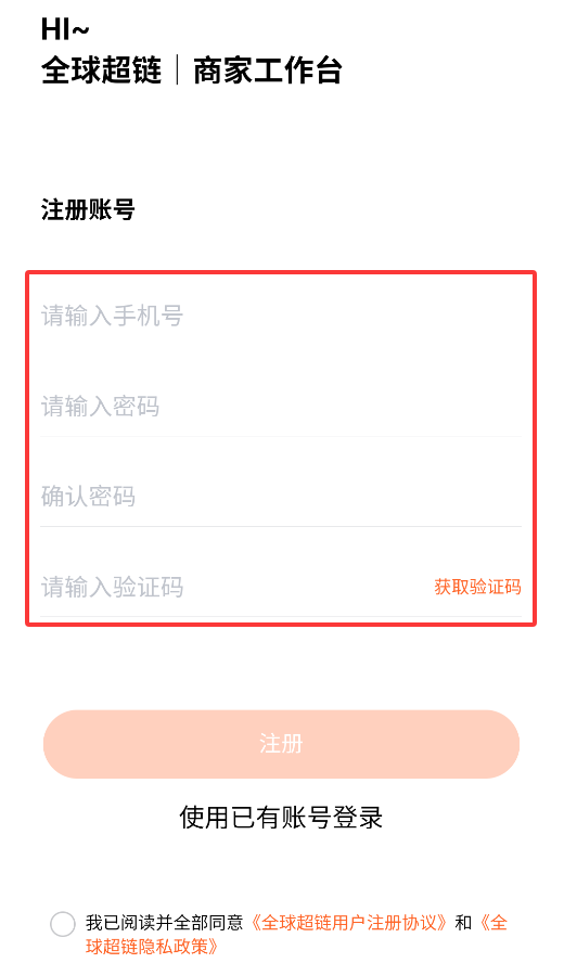 2、按照提示填写手机号、设置密码并输入验证码,完成基本信息注册流程。