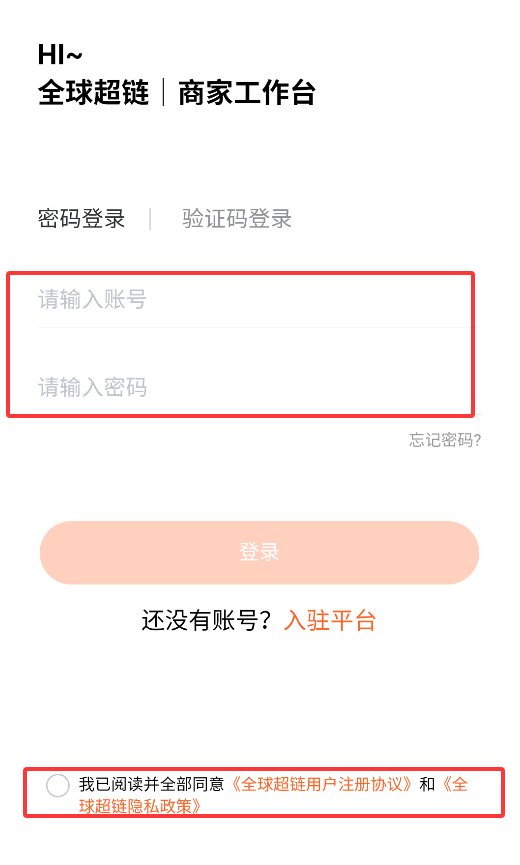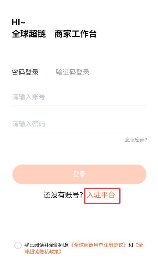 1、打开后,在登录页面选择"商家入驻"选项,进入平台入驻申请通道。