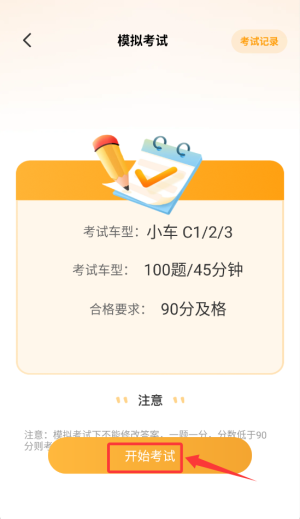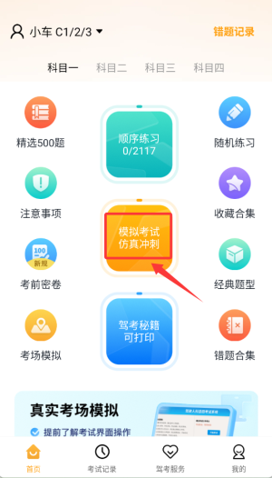 1、启动免费驾考刷题后,在首页功能栏选择"模拟考试"选项,进入测试准备界面。