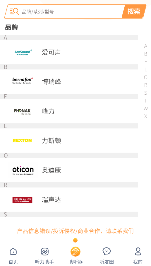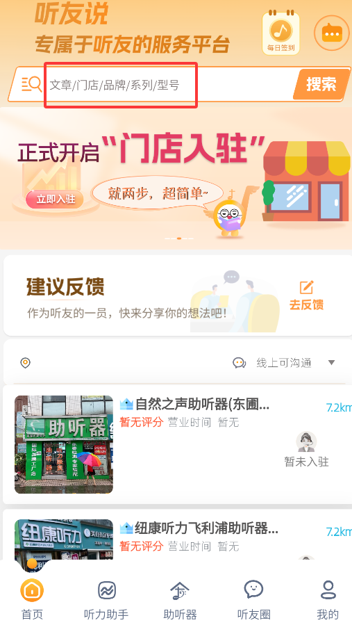 1、启动后,在智能搜索框输入关键词(如“助听器型号AX-12”),可快速查找相关产品评测、门店服务及科普文章。