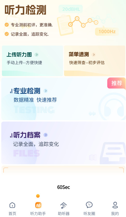 2、专业听力评估测试:提供医院级在线听力精准测试服务,全面评估当前听力水平状况,给出专业改善建议方案。