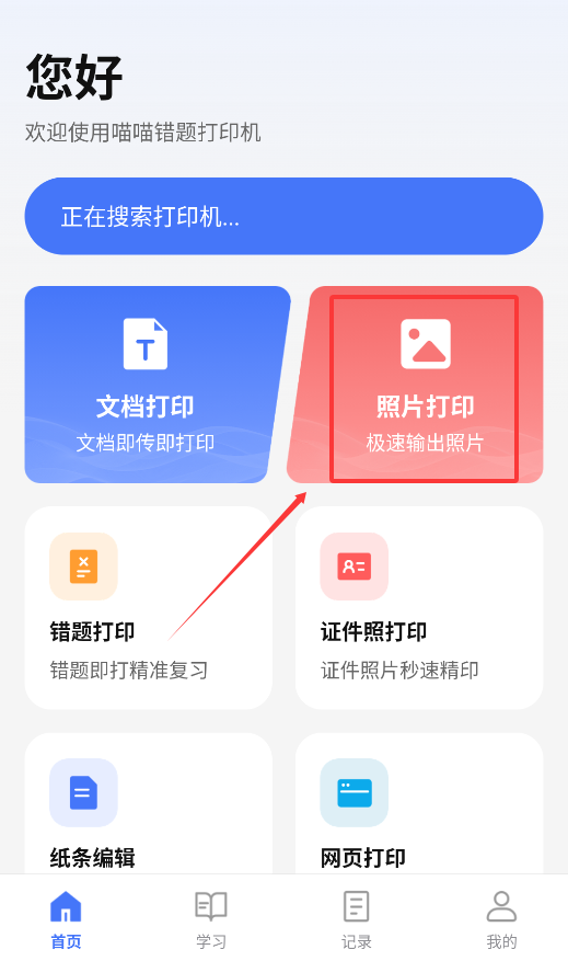 1、启动后,在首页找到"照片打印"功能入口,点击即可进入照片编辑界面。