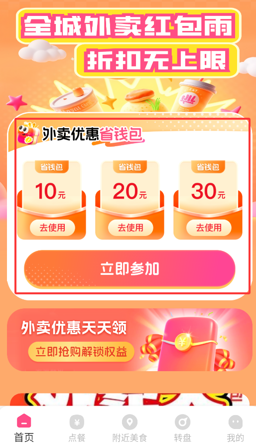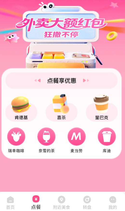 外卖优惠挺实用的,专门帮你找各种外卖红包和折扣。打开就能领全城的外卖优惠券,点餐时直接抵扣,比原价便宜不少。里面经常搞活动,能抢到更划算的补贴。最方便的是有个转盘功能,不知道吃啥的时候转一下,随机推荐附近美食,治好了我的选择困难症。经常点外卖的可以试试,确实能省不少钱。