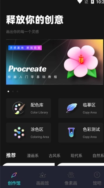1、通过本站安装Pocket绘画软件,打开进入,在软件首页就是【创作馆】页面,我们可以选择配色库、临摹区、涂色区、色彩测试进入。