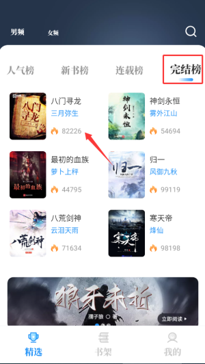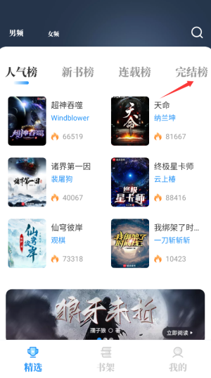 1、打开海鱼小说应用后,在首页的导航栏里找到并点击“完结榜单”这一栏目,该栏目呈现的是已经完结的优质小说作品。