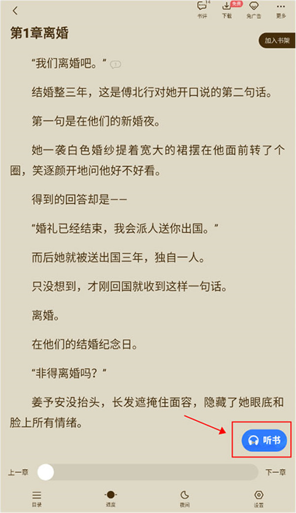 2、在小说阅读界面,点击屏幕,会显示“听书”的图标。
