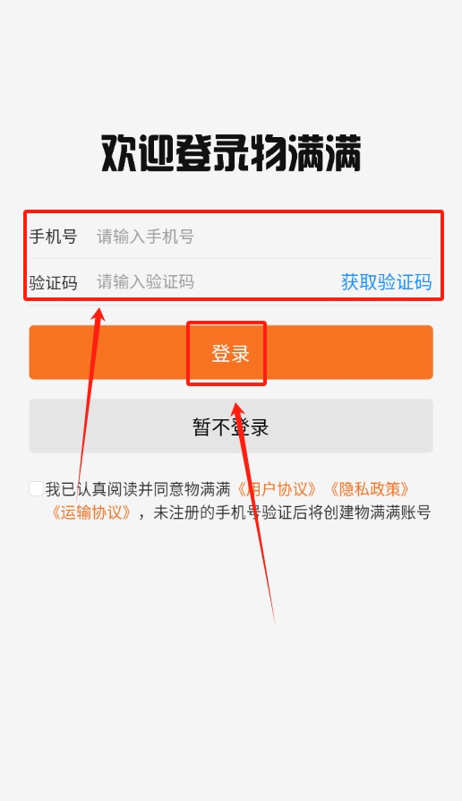 1、启动物满满专线查询软件,进入登录页面后输入手机号码,待获取验证码并填写完成,即可完成账号登录操作。