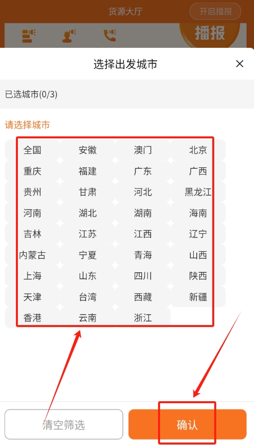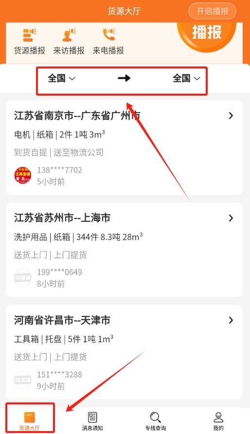 2、登录成功后,回到首页进入货源大厅,分别在出发地和目的地栏选择好对应的城市。