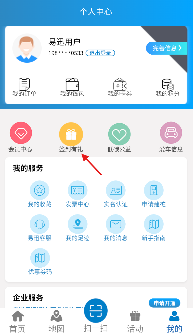 2、跳转至 “我的” 页面,仔细查找 “签到有礼” 板块,找到后点击进入签到界面。