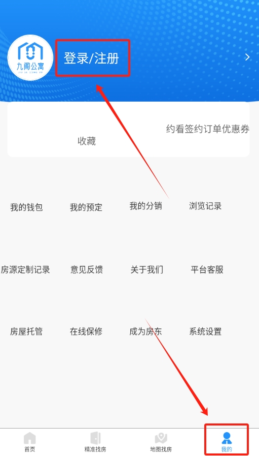 1、打开九阁公寓APP,在页面底部找到“我的”选项,点击进入后即可看到登录按钮。