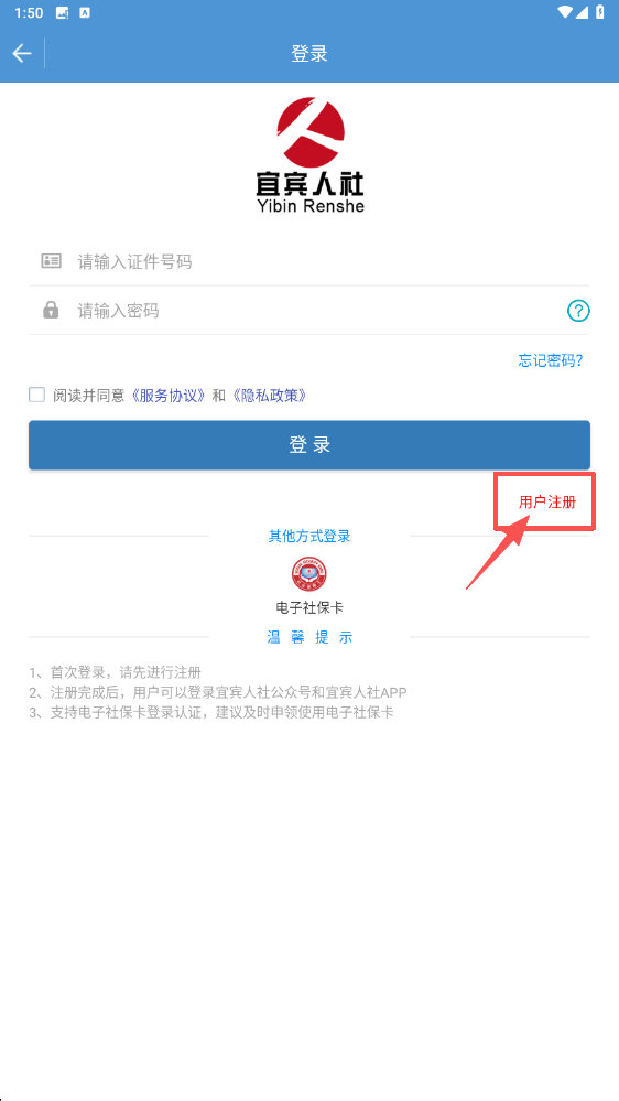 3、在登录界面,点击用户注册选项,进入用户注册页面。