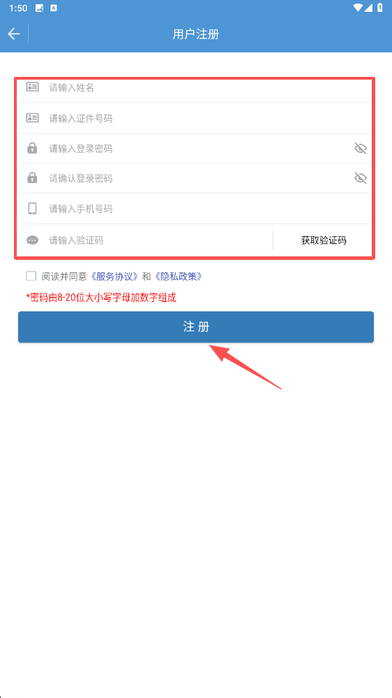 4在用户注册界面,按顺序填写个人姓名、有效证件编号、登录密码,并勾选相关协议条款,随后点击注册按键,即可完成注册流程。