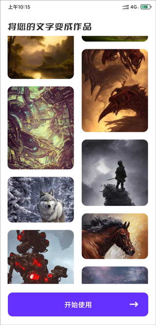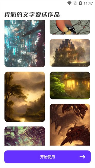 用户打开已安装完成的梦幻AI画家应用后,点击界面上的“开始使用”按钮,即可进入AI绘画的创作世界。