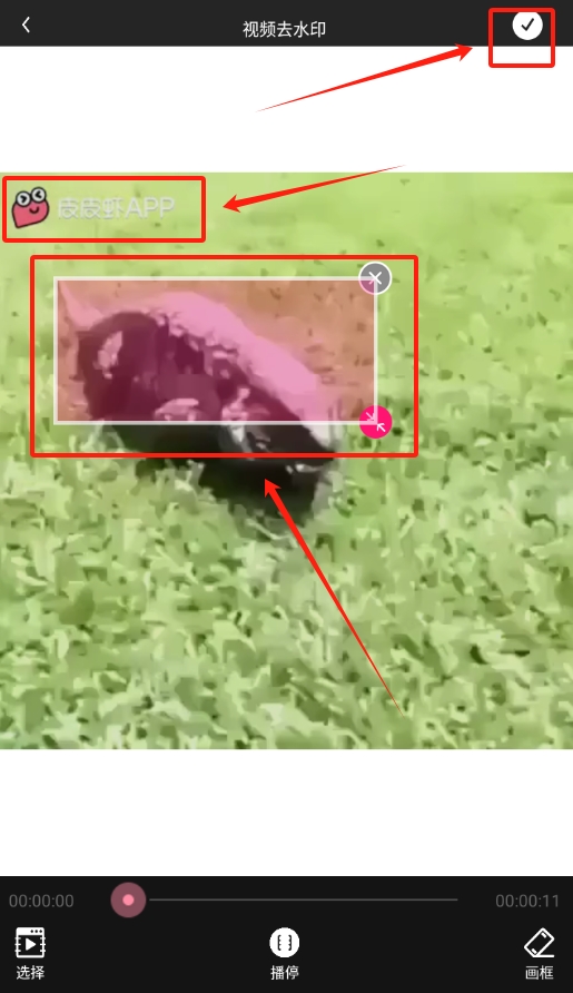 3、使用去水印功能时,可在预览画面中通过画框标记出需要去除水印的区域,确认标记无误后点击保存按钮,即可完成去水印操作。