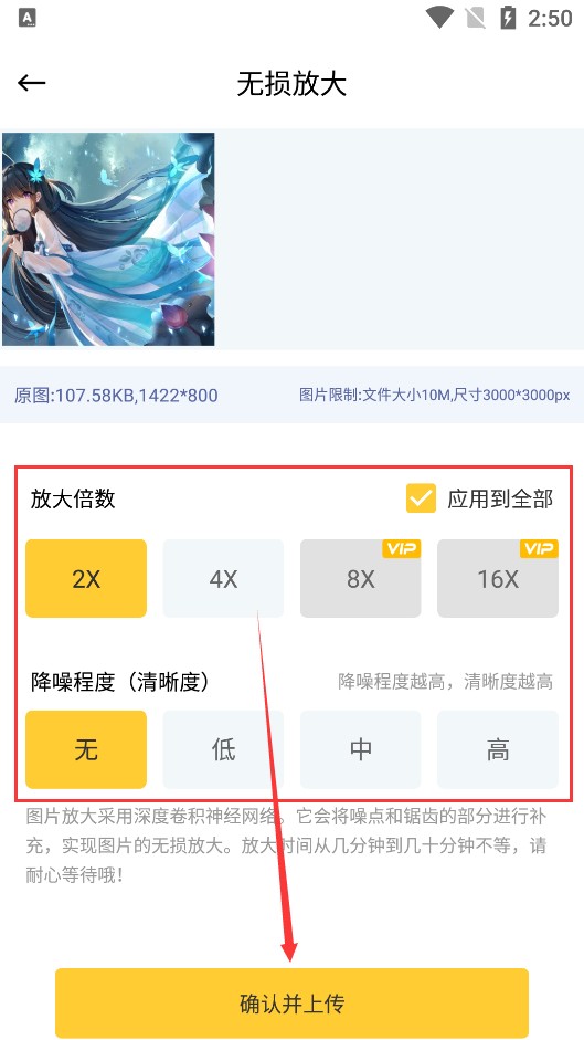 3、依据需求挑选你期望的放大倍数与降噪等级,调整妥当后点击【上传】按钮。