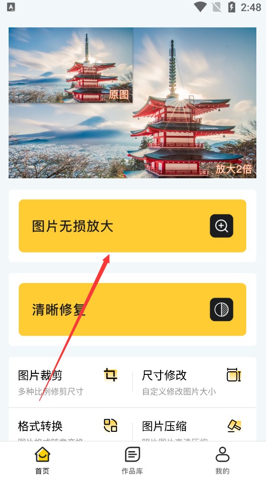 1、开启照片清晰修复功能,在首页可以看到各类功能选项,首先选择【图片无损放大】。