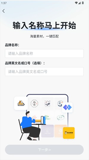 2、请输入您的品牌名称、想要传达的口号,还可以补充对应的英文名,填写完成后点击“下一步”按钮。