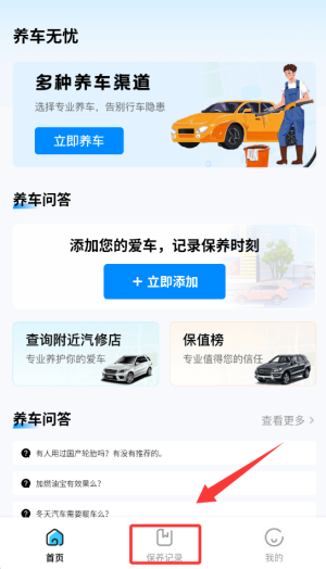 1、打开汽车养车无忧应用,在首页找到并点击“保养记录”选项,即可进入保养记录功能页面。