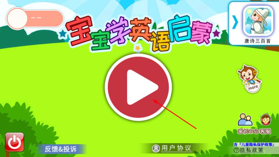 1、点击宝宝学英语启蒙页面中间的红色播放按钮,即可进入学习选择页面。