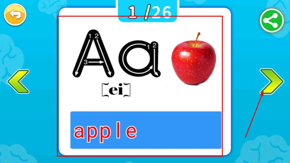 3、在字母学习页面,学习字母Aa以及与之相关的单词le,点击箭头即可进入下一阶段的学习。