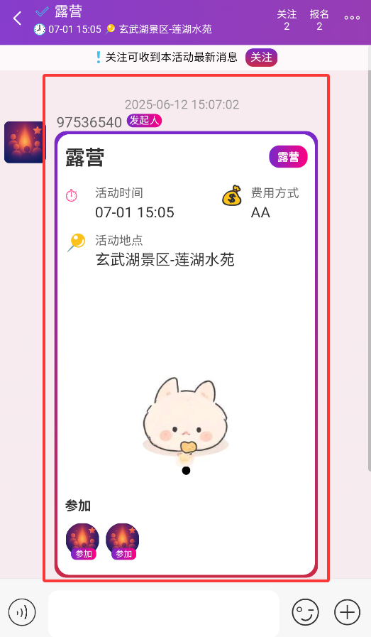 4、活动后的互动环节:借助群聊功能维系彼此的联系,在互相关注之后,双方就能查看对方的动态以及最新的活动信息。
