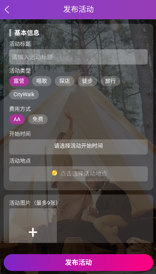 1、快速创建活动:在首页点击“发起活动”按钮,填写相关基本信息并发布,之后等待参与者加入即可。