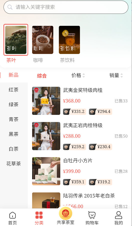 2、通过分类导航按茶叶品类(红茶/普洱)、产地等条件精准筛选目标商品。