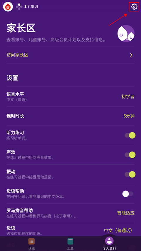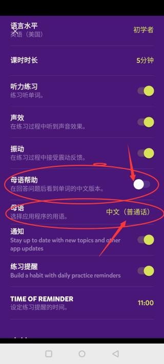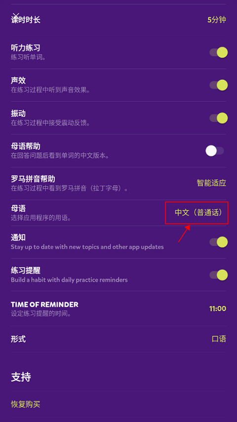 4、找到“母语”选项,就可更改母语了。这里以中文为例,用户还可选择开启“母语帮助”功能,将单词自动翻译成母语中文版本。
