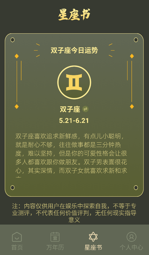 4、星座深度解析:结合西方星座与东方命理,提供每日运势、性格分析等全方位星座解读。