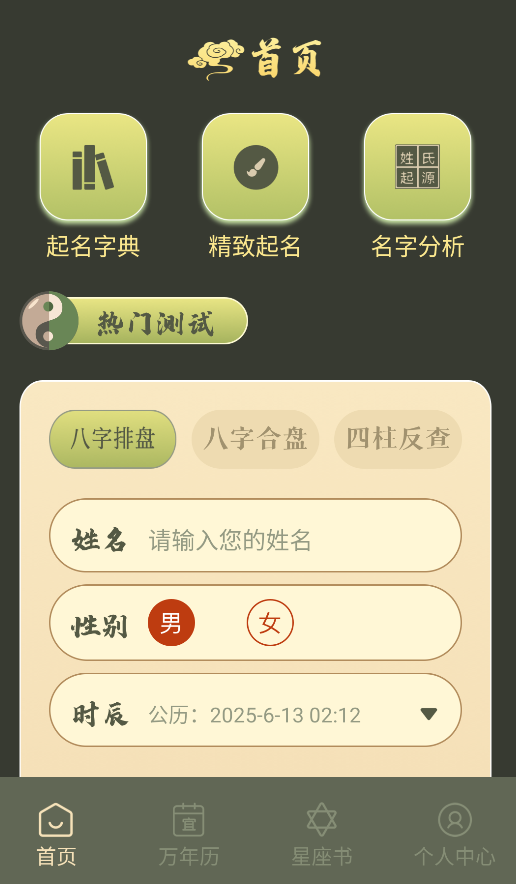 1、进入应用首页,点击"八字排盘"功能,输入出生时间等信息,系统会自动生成详细命理分析报告。