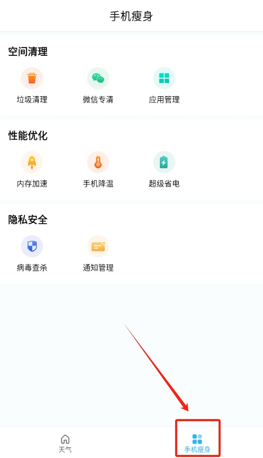3、软件里还有手机瘦身页面,点进去可以清理手机内存,让手机运行更流畅。