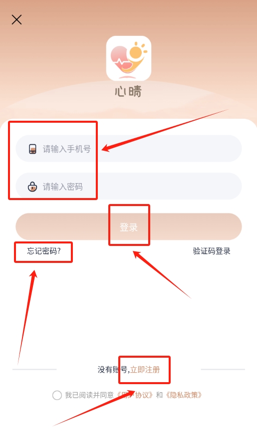 1、简单便捷的软件安装步骤:在应用商店搜索心晴100,安装完成后注册账号进入主界面。