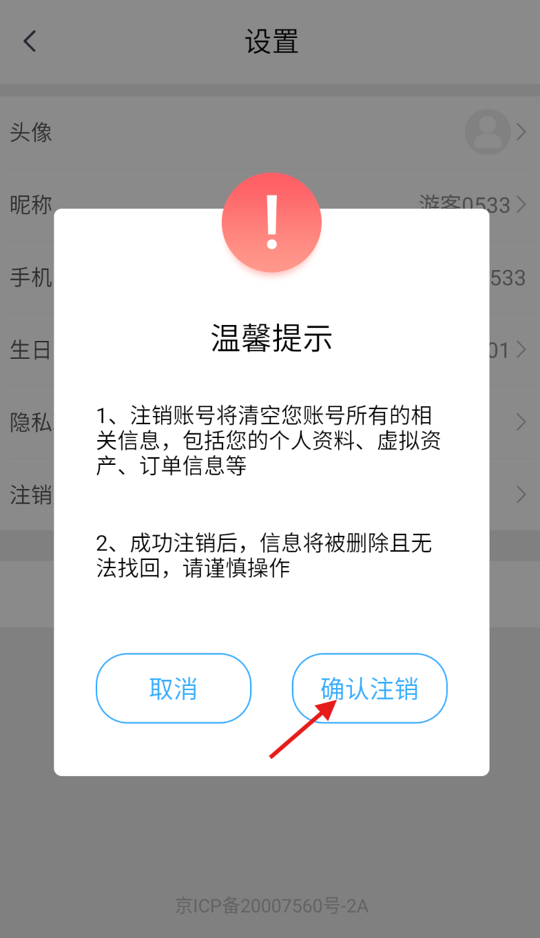4、最后阅读完温馨提示,然后再点击确认注销即可完成。