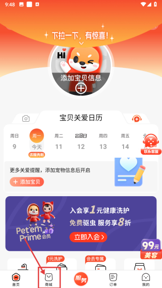 1、进入宠物用品分类,点击底部的商城选项,即可进入商城页面。