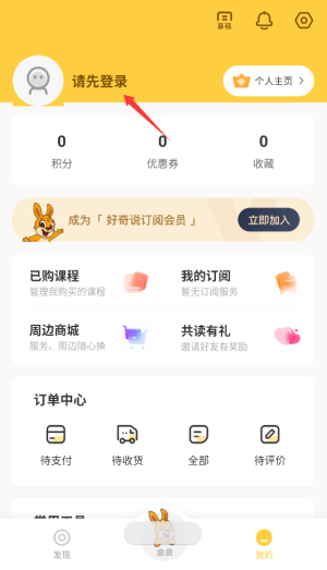 1、启动好奇说绘本后,点击底部导航栏"我的"图标,进入账户管理页面。