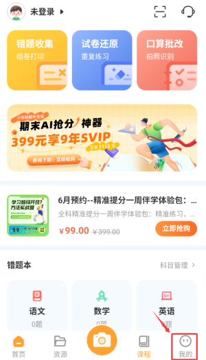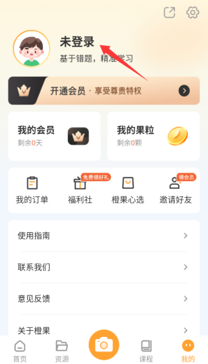 进入橙果错题本应用后,找到底部导航栏中的“我的”按钮并点击,即可进入账户管理界面。