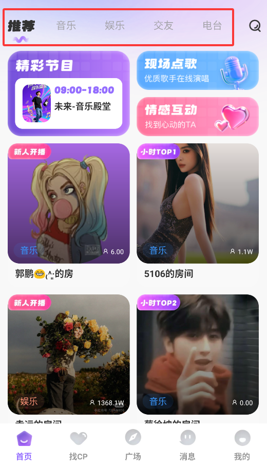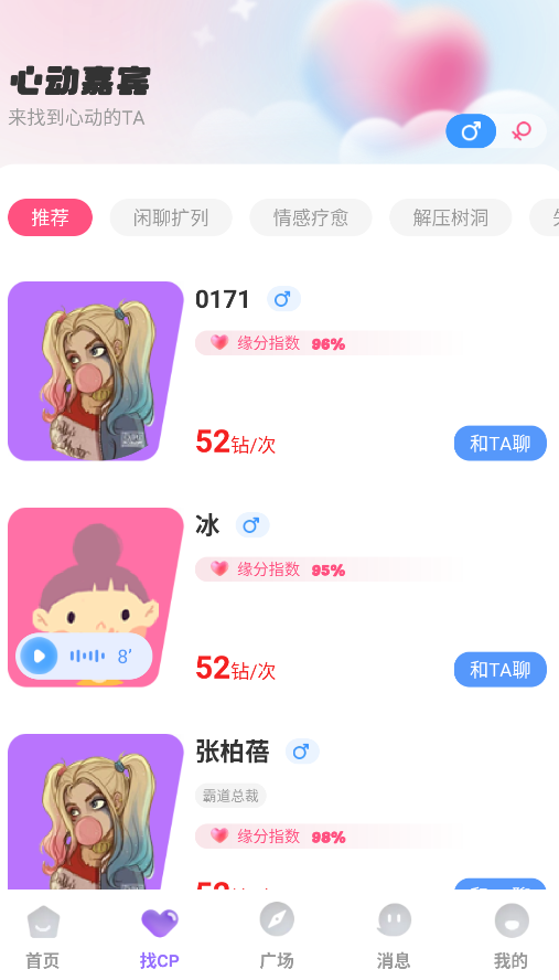 2、借助“CP匹配”功能设定偏好条件(比如声音类型、兴趣标签等),系统会每日为用户推荐契合度较高的对象。