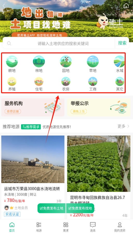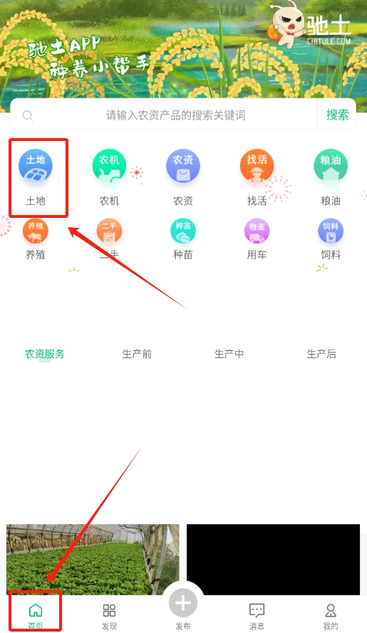 1、打开吃土农服软件,映入眼帘的便是软件首页,在众多选项中,点击 “土地” 选项。