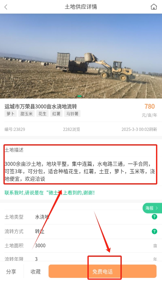 3、要是确定想买,不用着急,点击页面右下角的免费电话标识,即可联系土地主人沟通详情。