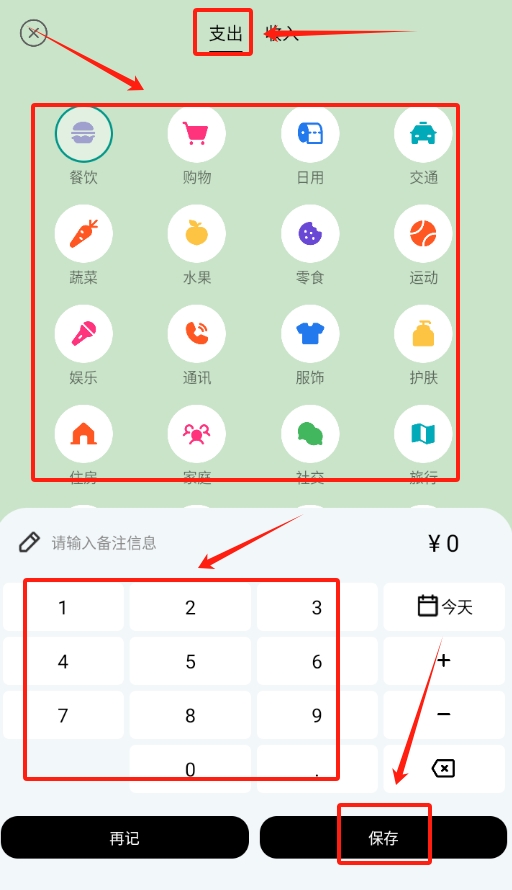 2、记录支出时,需先从各类支出类型中选择一项,接着输入具体的支出金额,确认信息准确后点击保存即可。