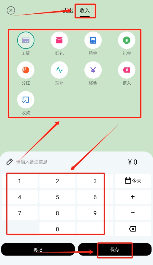 3、记录收入的操作也类似,选好对应的收入类型,填好收入金额,最后点击保存,就能轻松记录收入情况。