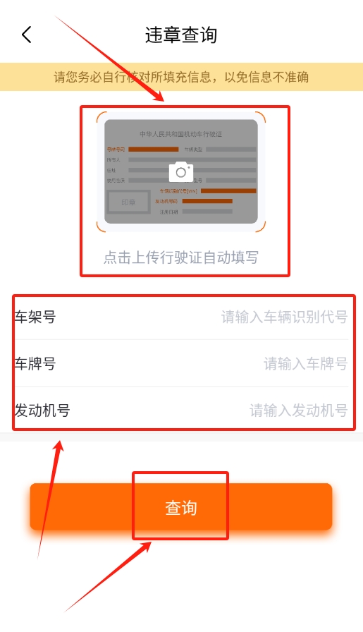 3、在查询页面输入车架号、车牌号和发动机号,若嫌手动输入麻烦,也可通过上传行驶证实现信息的自动填充。