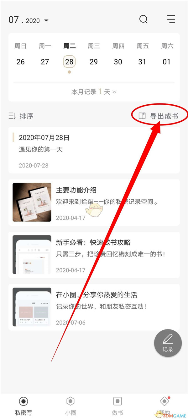 2、在记录页面编辑完内容后,返回首页并点击“导出成书”按钮。