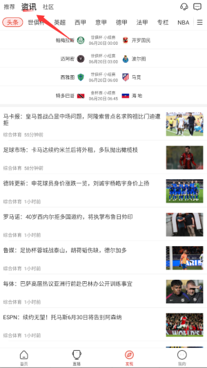 1、打开疯狂体育应用后,在首页的导航栏中点击“资讯”板块,该板块会每日更新全球范围内的各类赛事资讯。