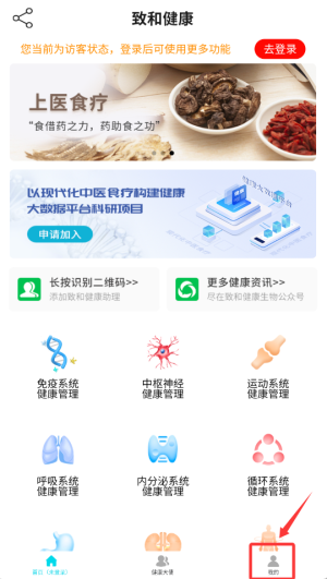 1、打开致和信息健康应用后,在首页右下角找到“我的”入口,点击该入口即可进入账户管理页面。