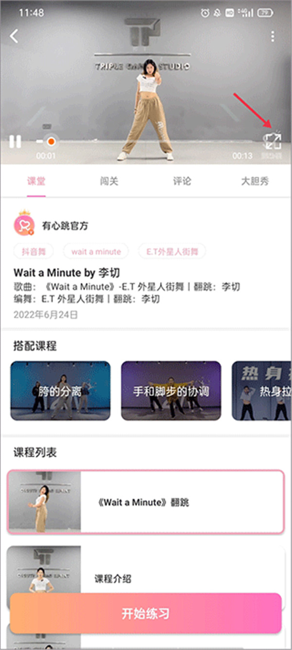 3.随时随地进行练习,用户在家也能够轻松上手进行学习,满足用户的需求。1、启动软件后,任意选择一个视频打开,进入视频详情页后,点击全屏放大按钮。