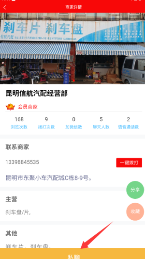 3、挑选好商品后,点击“私聊”按钮,借助私聊功能向商家询问配件的具体信息,或者进行价格商议。