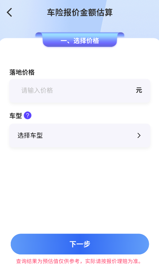 1、启动后,进入“车险计算”专区,选择对应服务(新车/续保/理赔估算)。