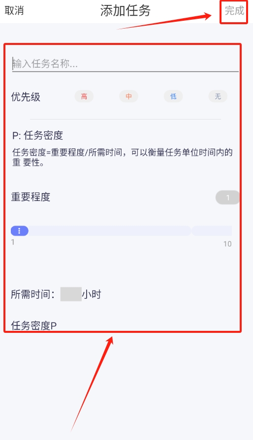 2、点击加号后,会弹出输入框,在这里依次输入任务名称、优先级、重要程度以及所需时间,全部填好后,点击右上角的完成。
